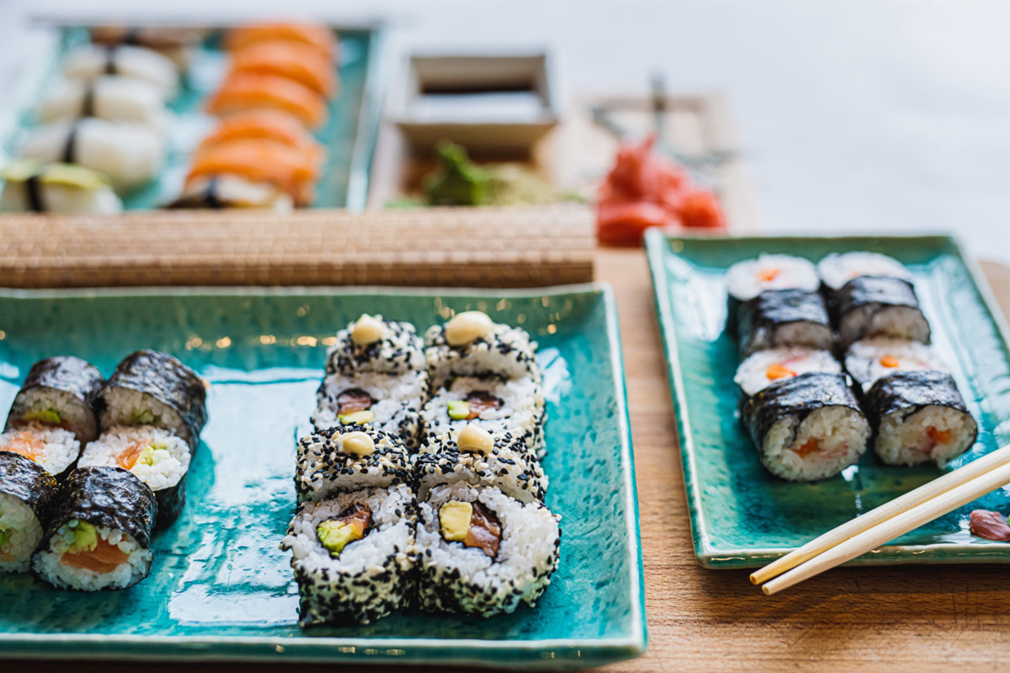 Král jednoduchosti je nigiri (rýže + plátek). Maki/hosomaki jsou tenké trubičky v nori, futomaki s bohatší náplní, uramaki dávají rýži ven. Temaki do ruky na party, chirashi „rozsypané“ do misky. Důležité je znát etiketu (sojovka jen lehce, zázvor mezi sousty) a naučit se pracovat s nožem i vlhkostí, aby role držely tvar a nepromáčely se.
