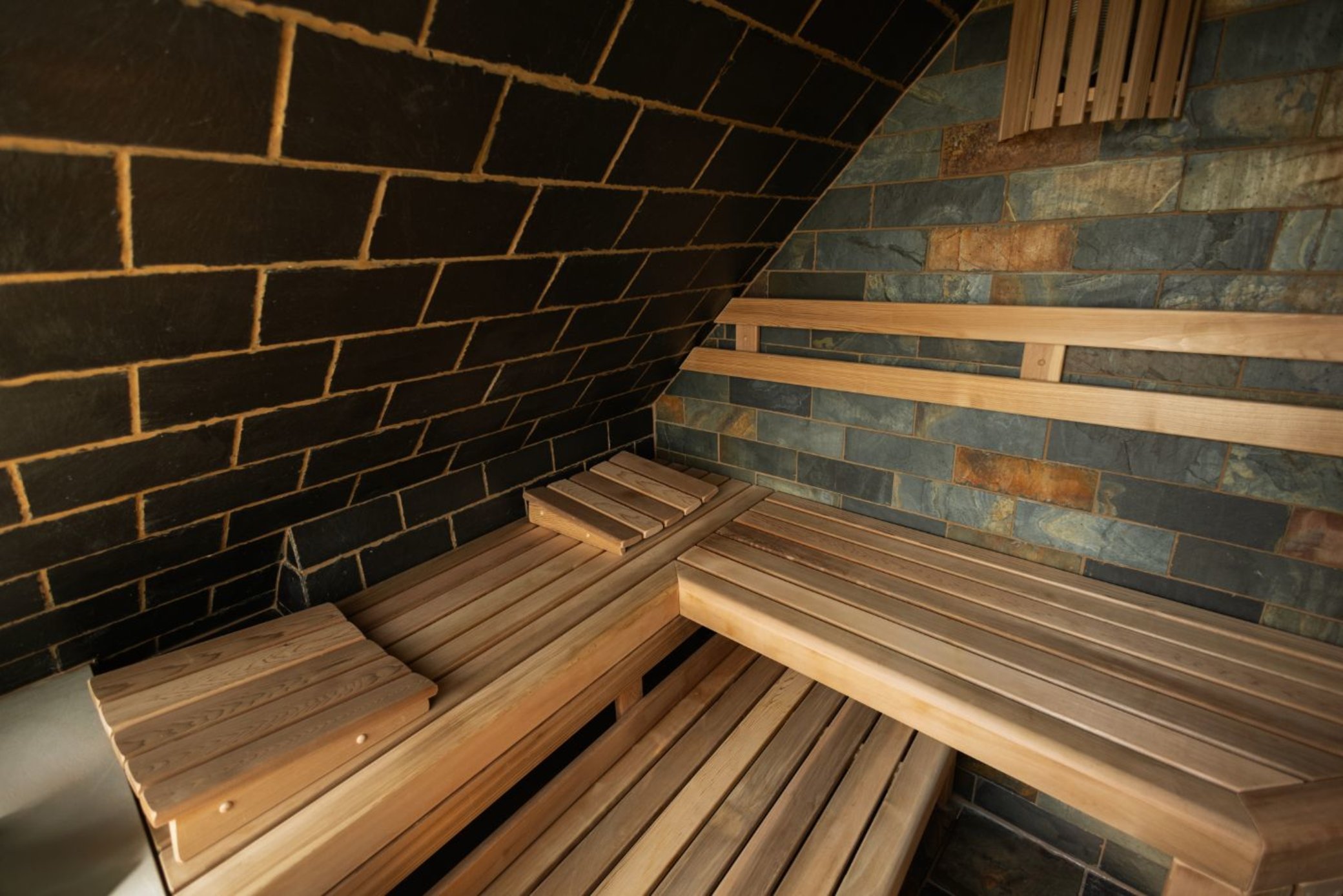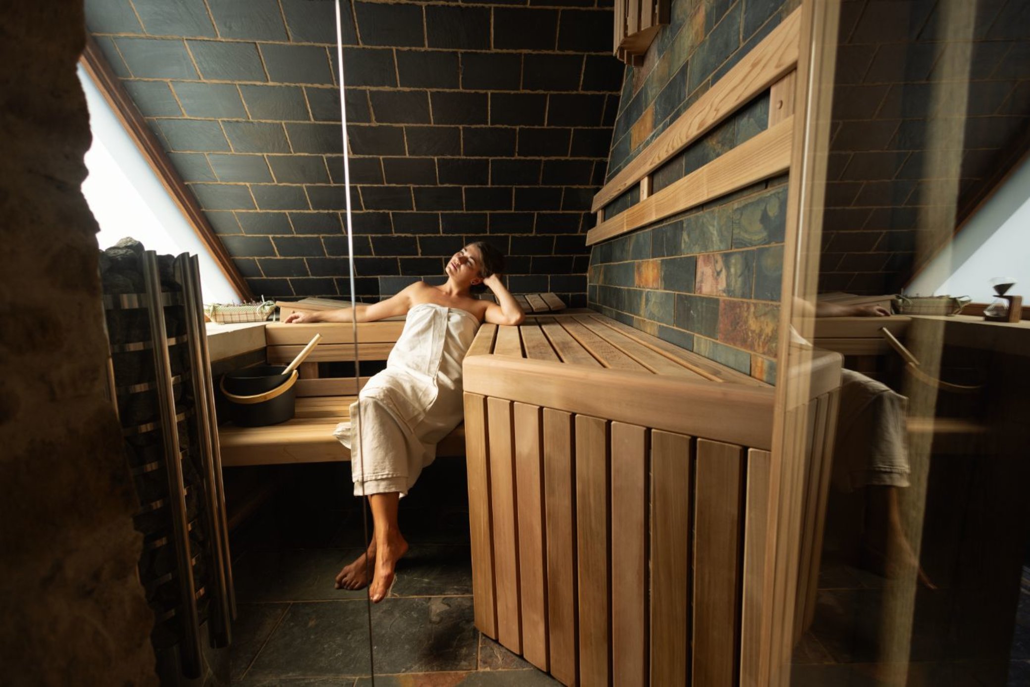 - Parní saunu s eukalyptem a vyhřívanou lavicí